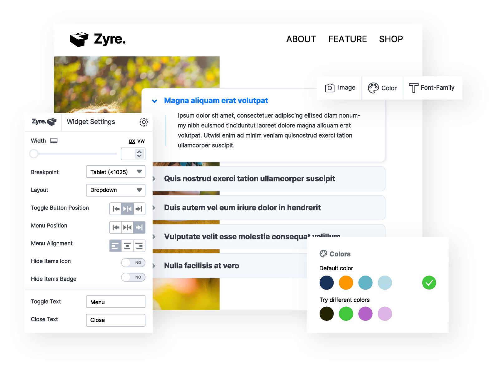 Customize every detail of your Advance Accordion— type, orientation, alignment, colors, size, & more—to achieve a seamless and personalized design.