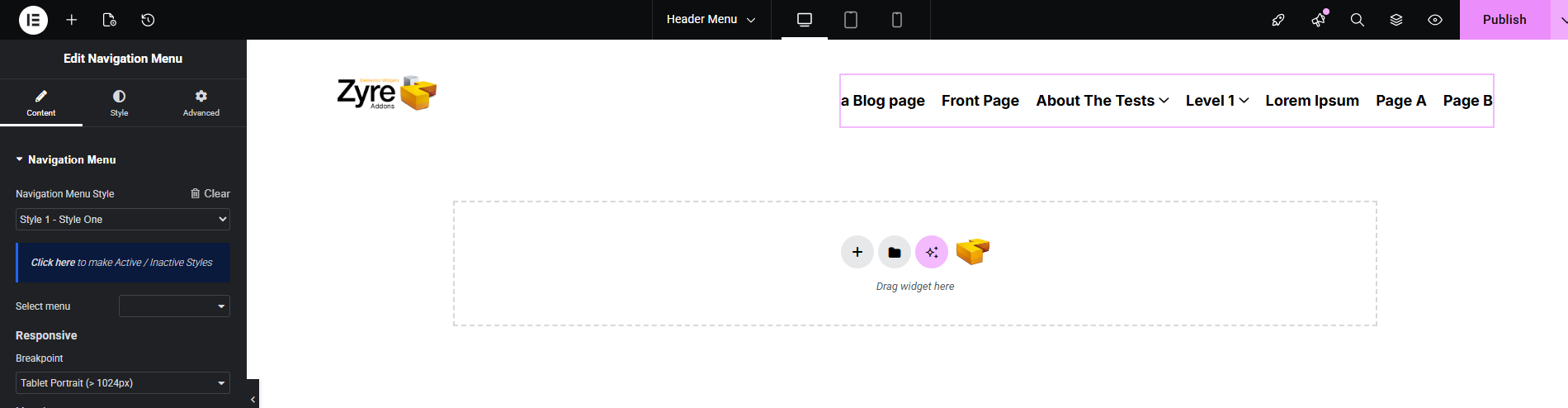 - Use Zyre widgets (site logo, menu, search, etc.) to build your header layout as you want.