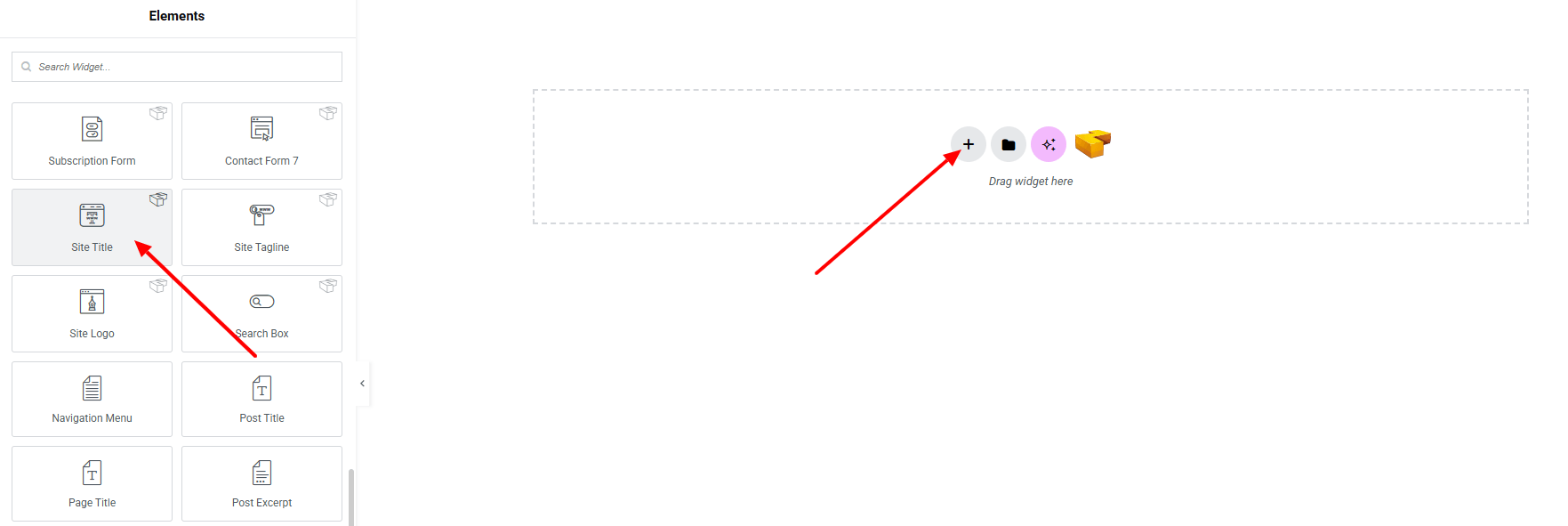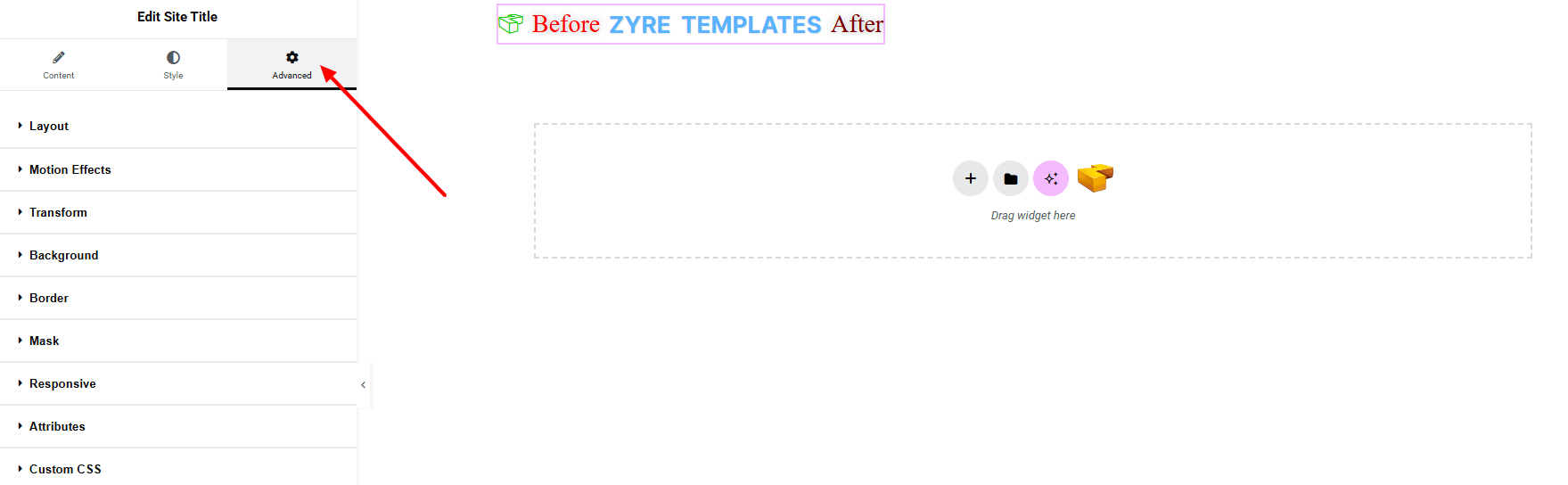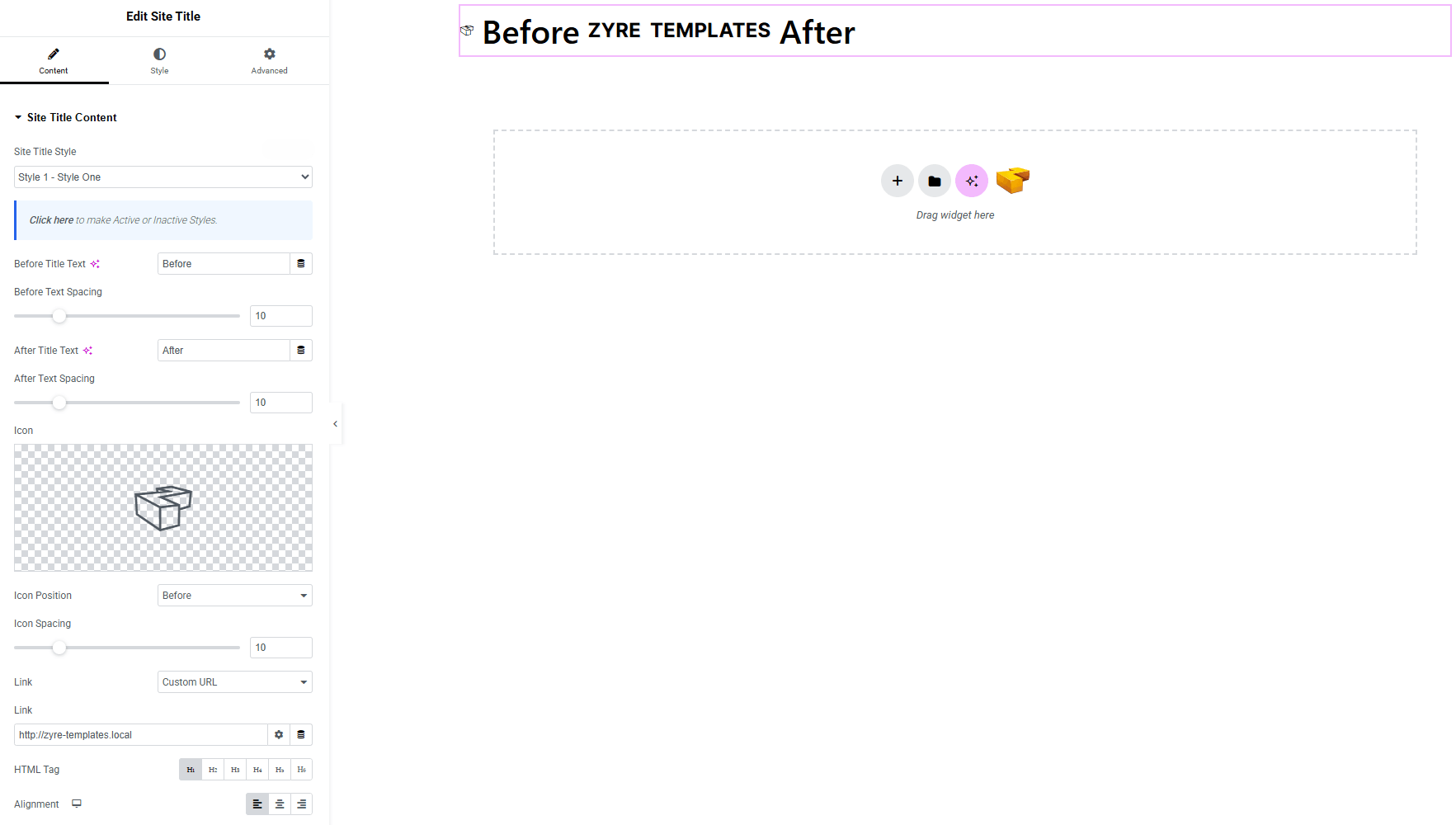 From the left panel, search or choose the Site Title Widget of Zyre Addon and simply drag it into your desired section.