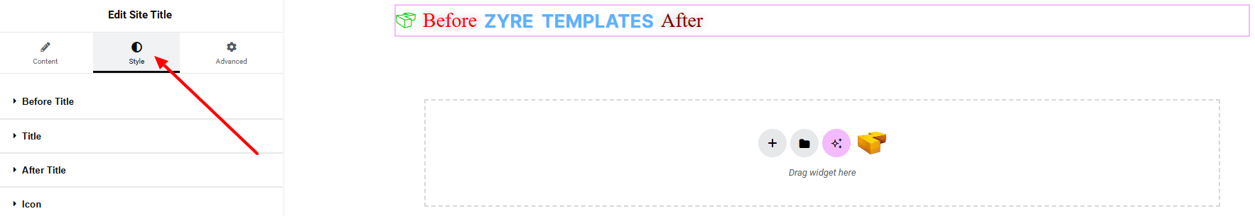 In the Style section, you can customize the Before Title, Title, After Title, Icon — but make sure you have added them first.