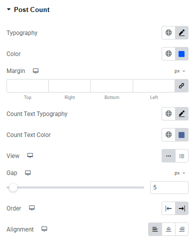 • Typography: Here you can customize the font family, size, weight, transform, style, decoration, line height, letter spacing, and word spacing for your text. Explore full typography settings here.