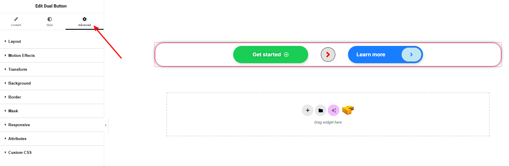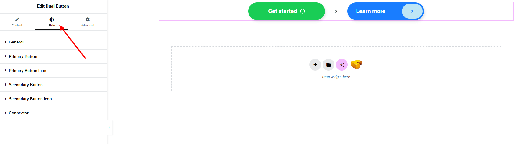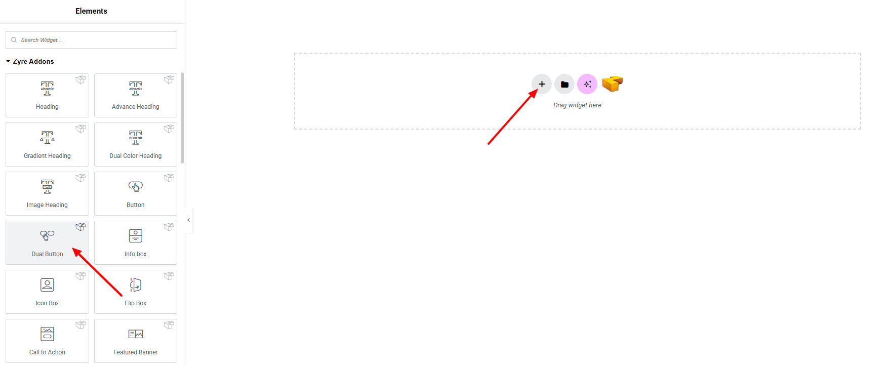 From the left panel, search or choose the Dual Button Widget of Zyre Addon and simply drag it into your desired section.