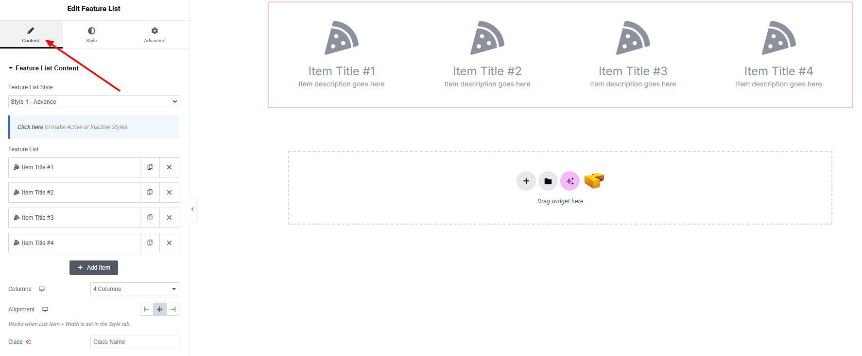 From the left panel, search or choose the Feature List of Zyre Addon and simply drag it into your desired section.