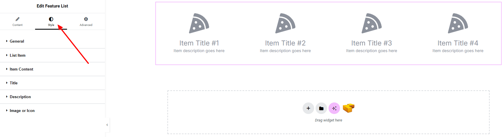 In the Style section, you can customize the General, List item, Item Content, Title, Description, Image or Icon— but make sure you have added them first.