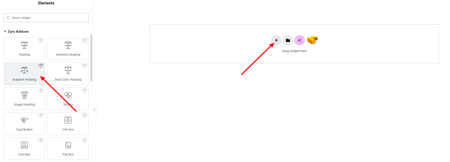 From the left panel, search or choose the Gradient Heading Widget of Zyre Addon and simply drag it into your desired section.