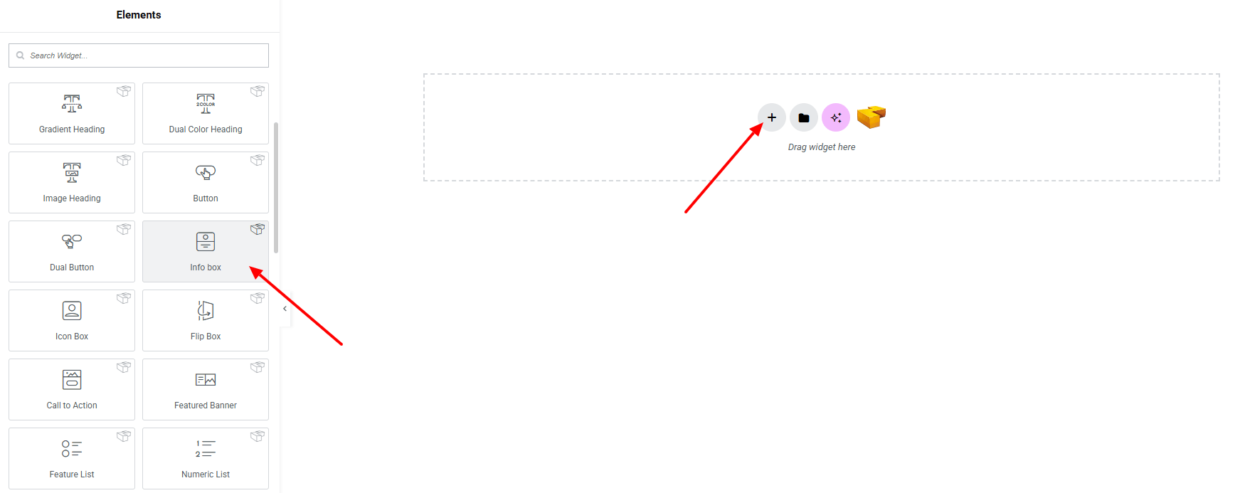 From the left panel, search or choose the Info Box of Zyre Addon and simply drag it into your desired section.