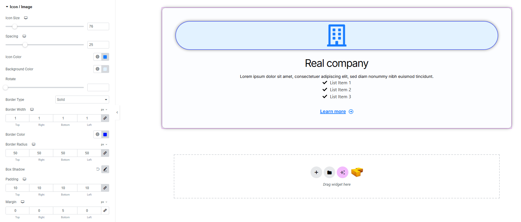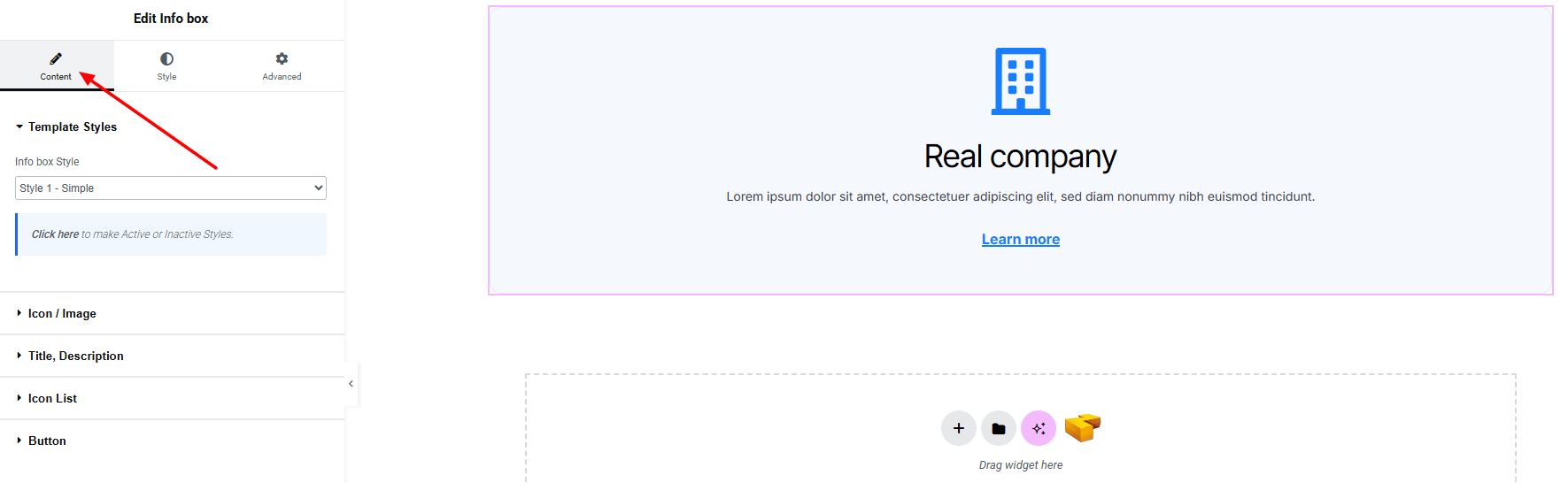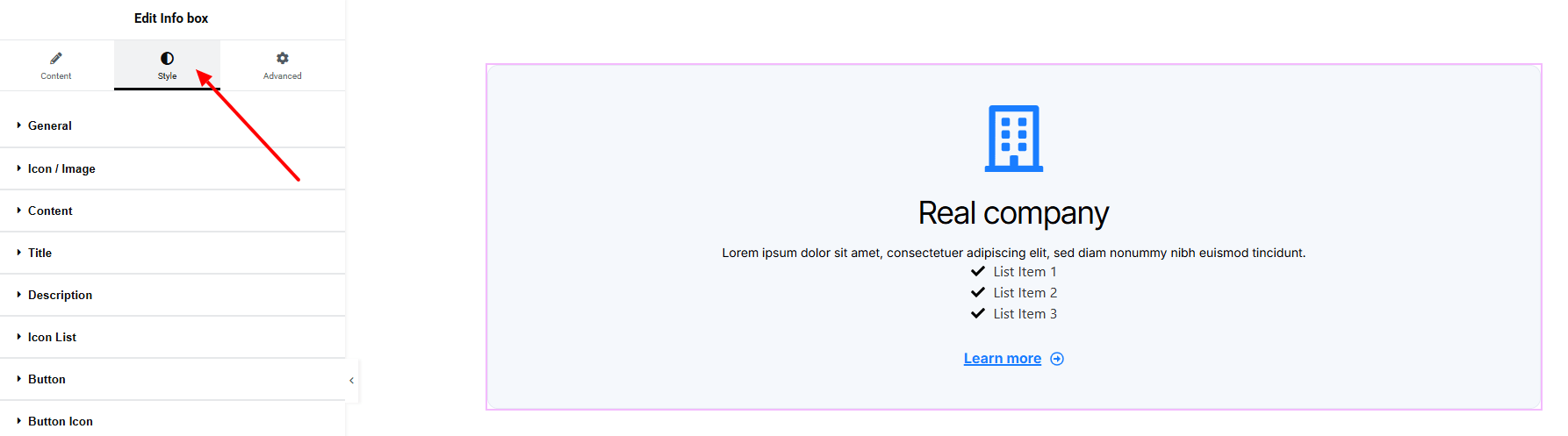 In the Style section, you can customize the General, Icon/image, Content, Title, Description, Icon list, Button, Button Icon — but make sure you have added them first.