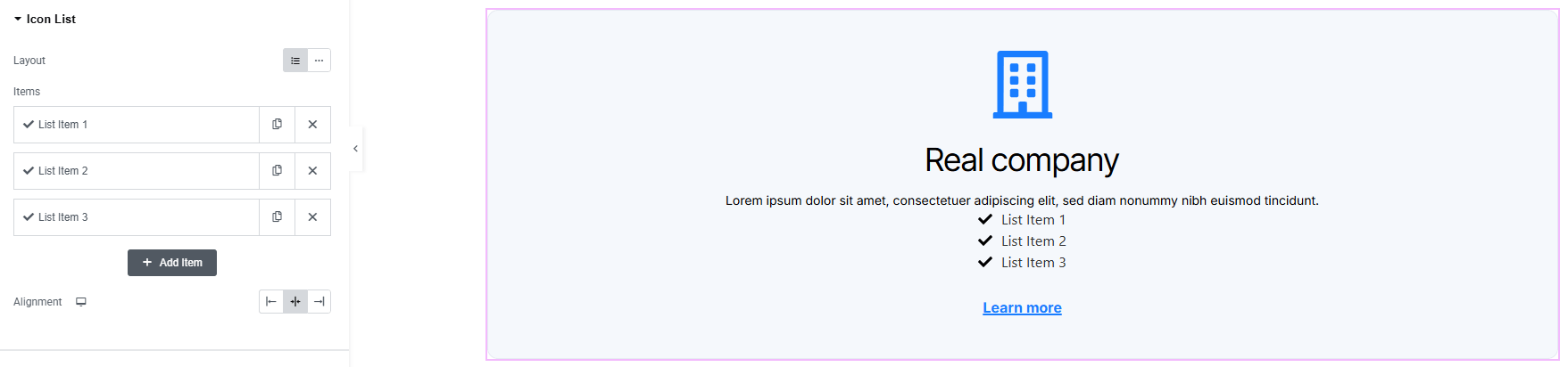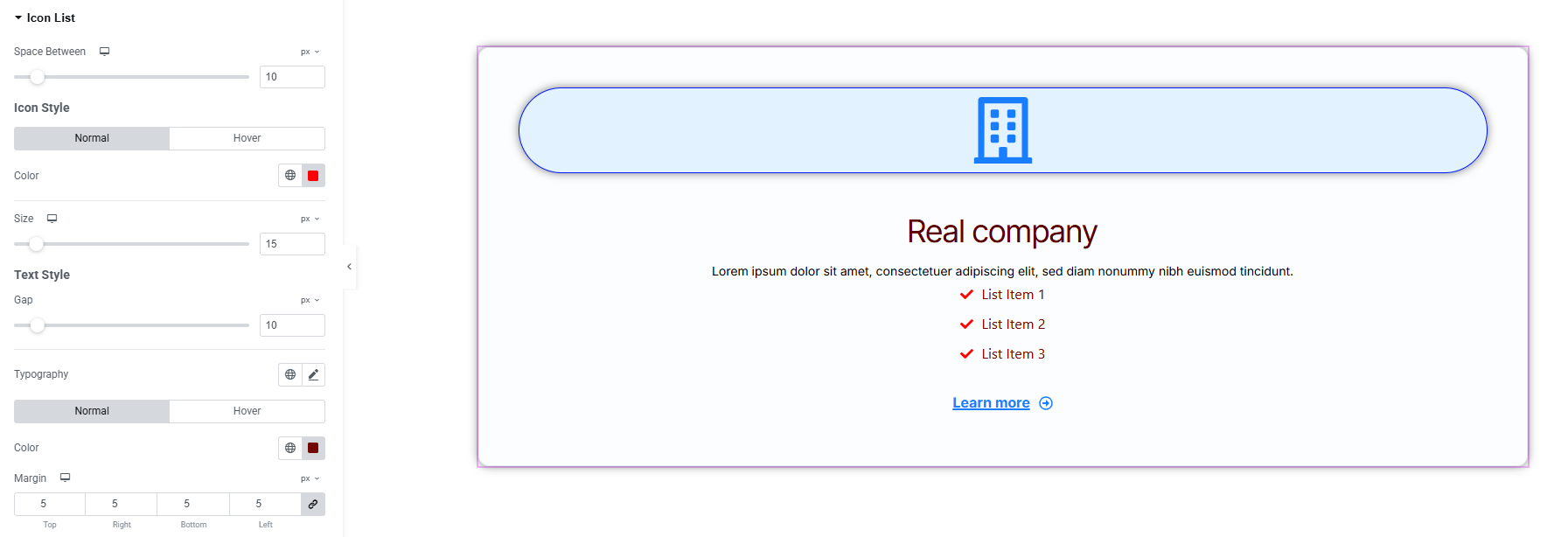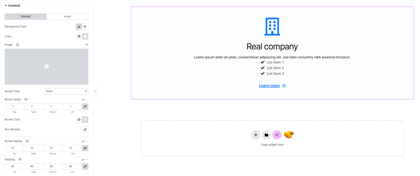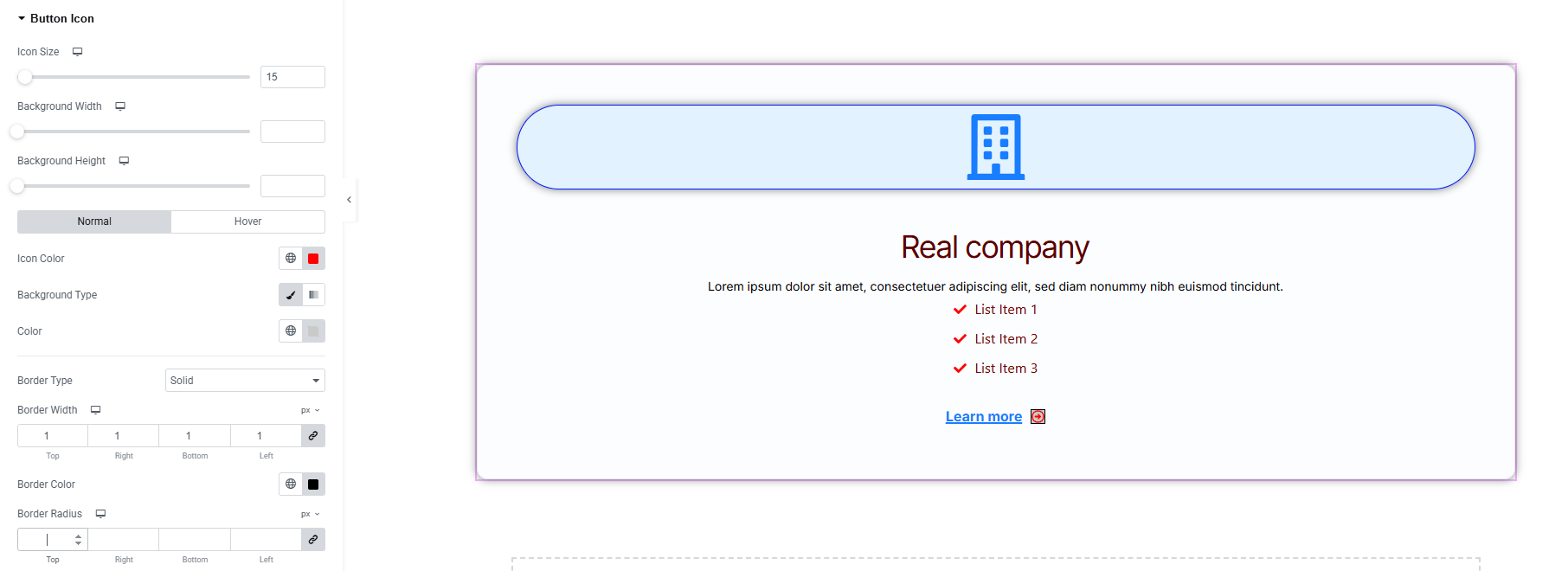 In the Style section, you can customize the General, Icon/image, Content, Title, Description, Icon list, Button, Button Icon — but make sure you have added them first.