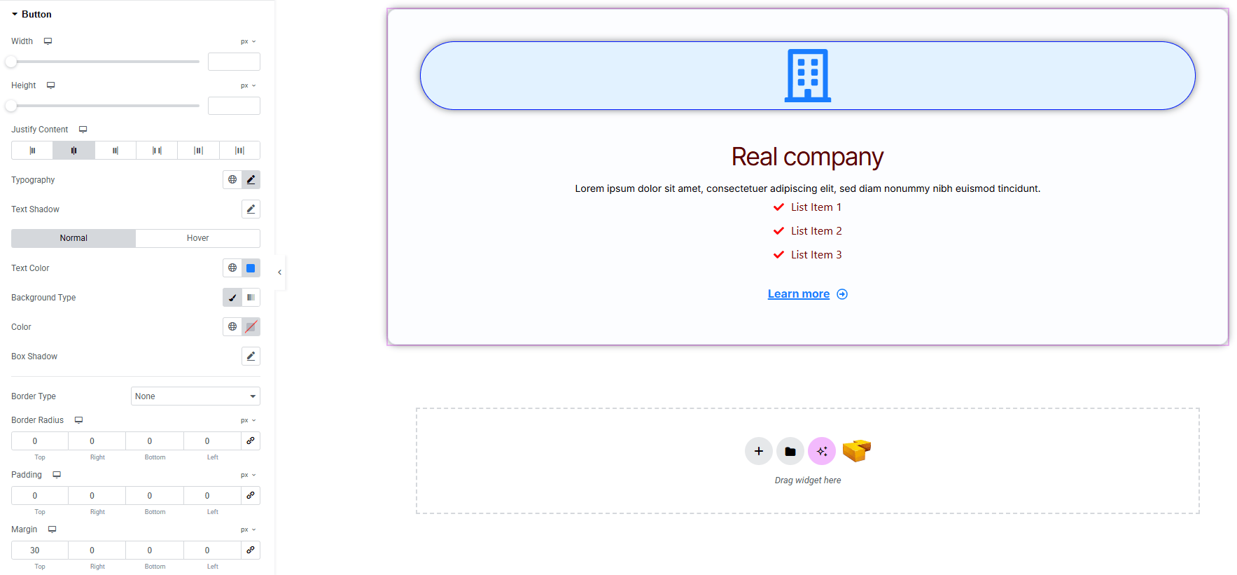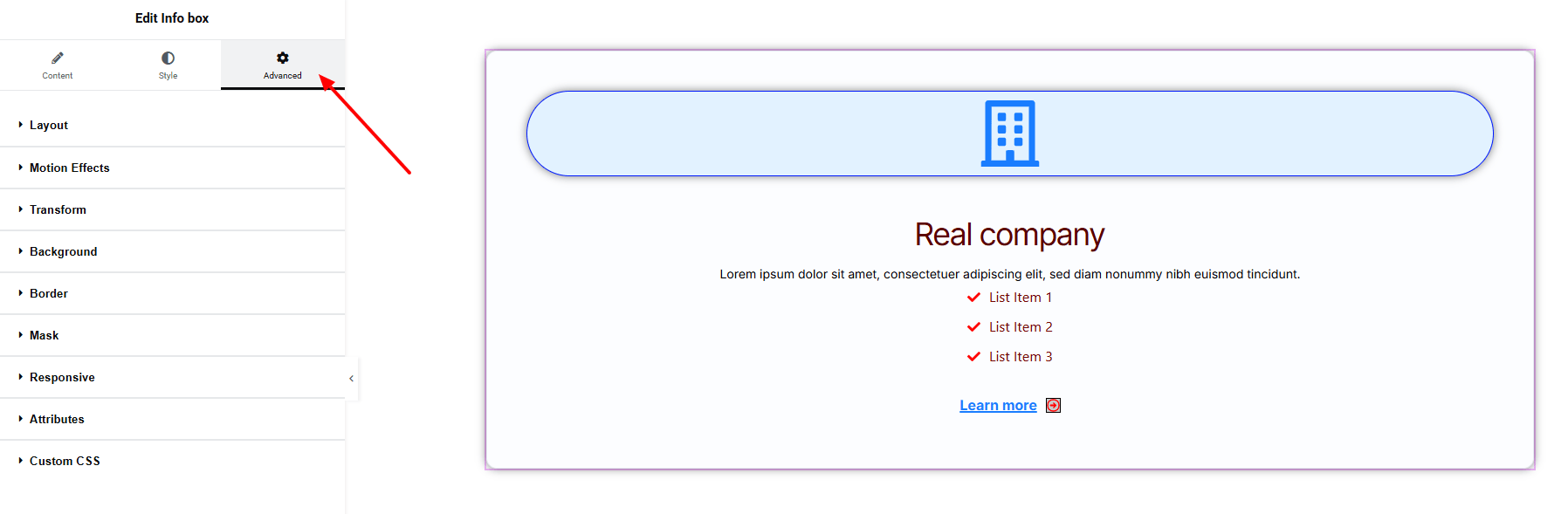 If you want to customize the layout, backgrounds, or make your design more engaging, head over to the Advanced section. The Advanced panel is a default Elementor feature. Check out this document to learn more about its features.