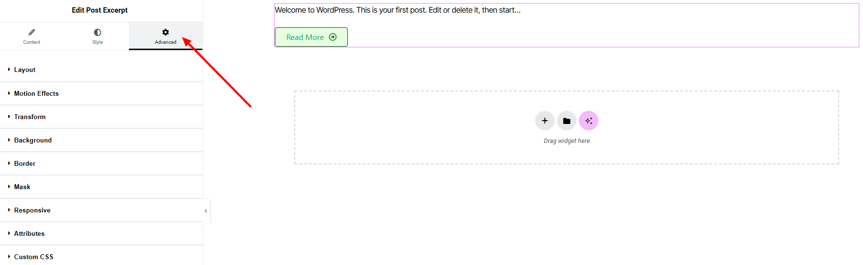 If you want to customize the layout, backgrounds, or make your design more engaging, head over to the Advanced section. The Advanced panel is a default Elementor feature. Check out this document to learn more about its features.