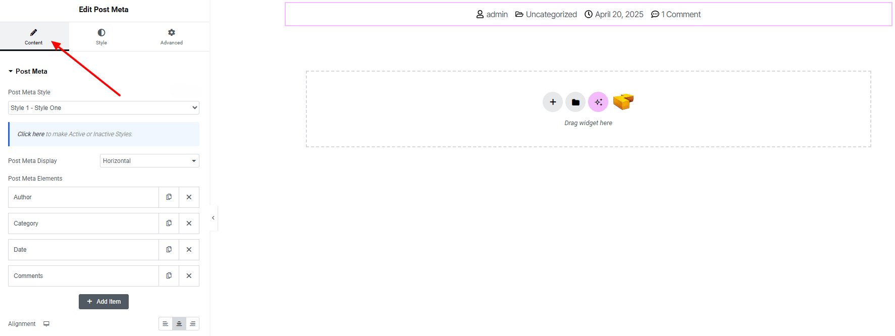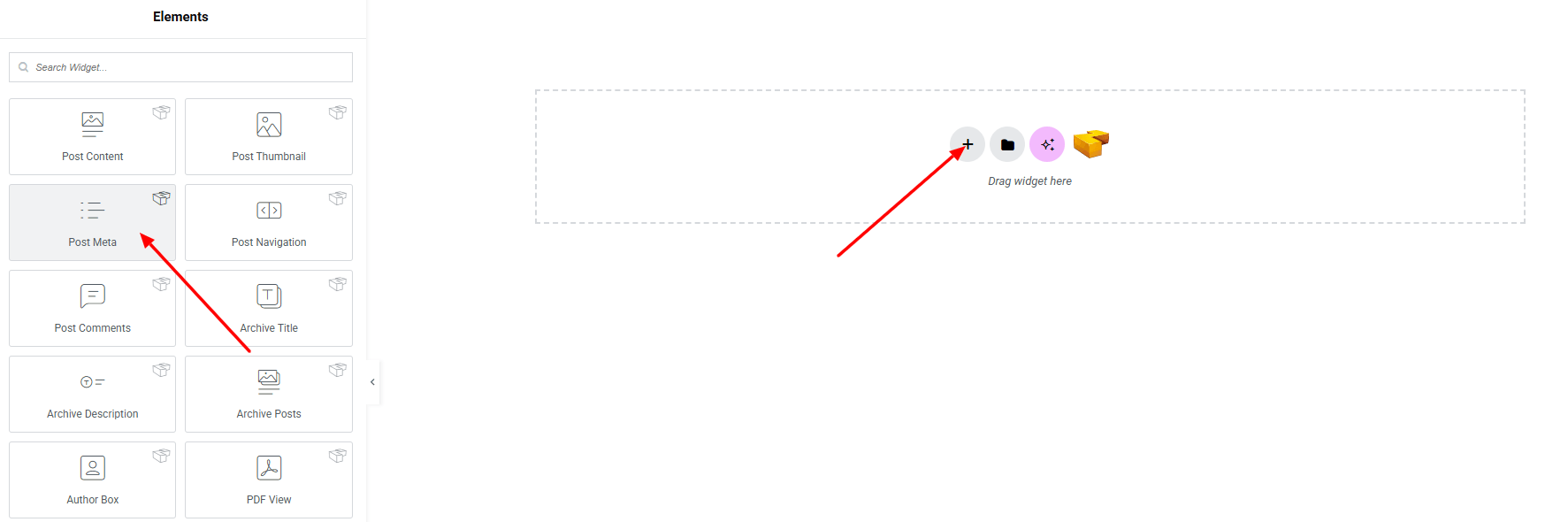 From the left panel, search or choose the Post Meta of Zyre Addon and simply drag it into your desired section.