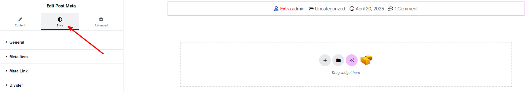 In the Style section, you can customize the General, Meta item, Meta Link, Divider — but make sure you have added them first.