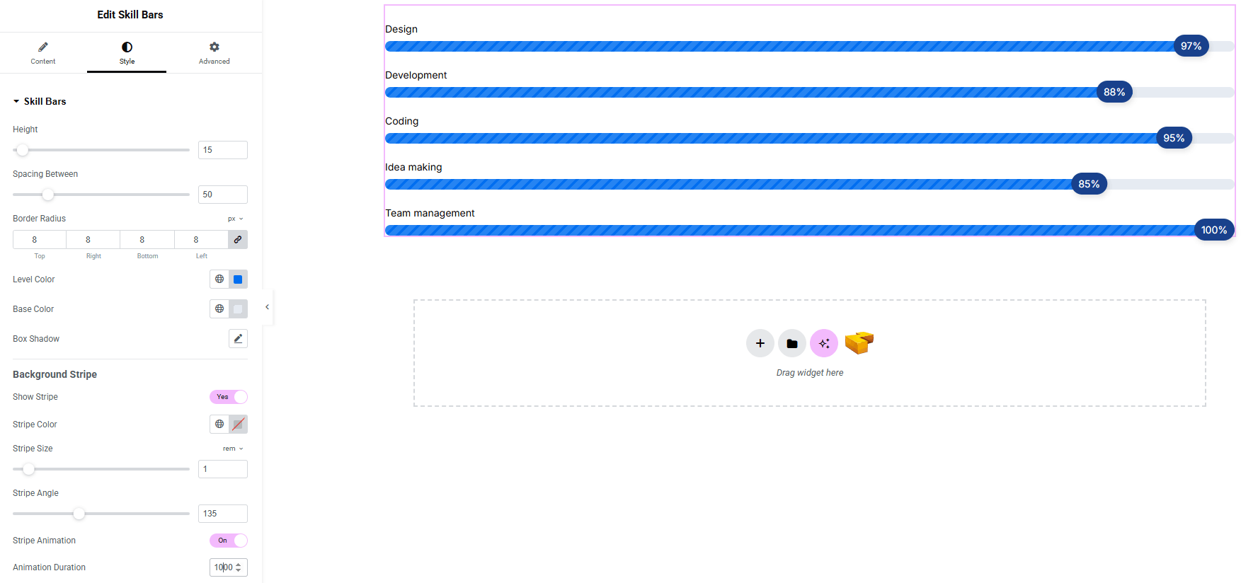 The Skill Bars widget of Zyre addon helps you visually showcase skills, progress, or expertise with animated progress bars. Ideal for portfolios, resumes, or service sections, it adds an interactive way to highlight strengths and achievements while keeping the design clean and professional.
