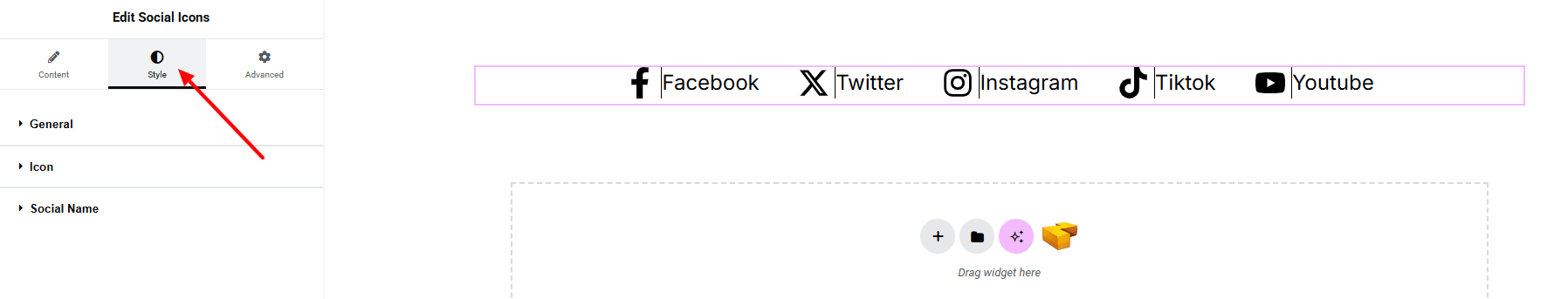 In the Style section, you can customize the General, Icon, Social Name — but make sure you have added them first.