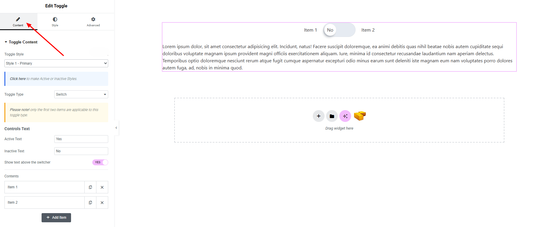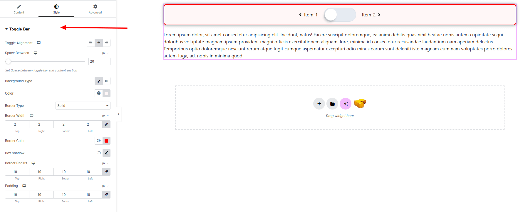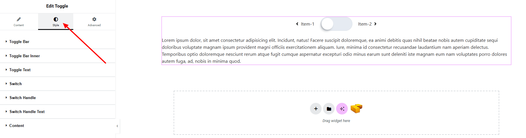 In the Style section, you can customize the Toggle Bar, Toggle Bar Inner, Toggle Text, Switch, Switch Handle, Switch Handle Text, Content— but make sure you have added them first.
