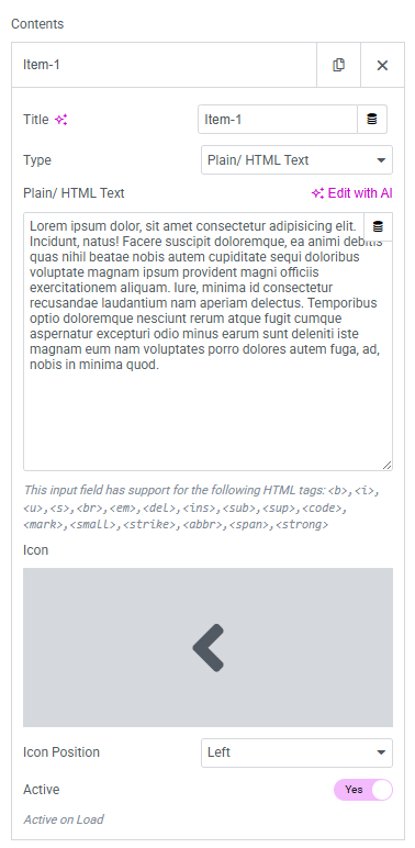 • Plain/HTML Text : Add content either as plain text or with HTML formatting.